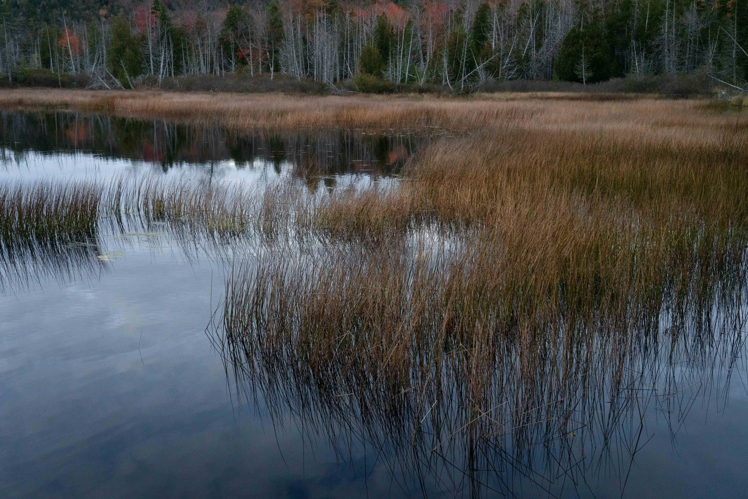 I hustled along the shoreline, trying to find a clearing amongst the brush that I could use for a foreground. I found a set of lily pads that looked nice, walked over, and immediately sunk about 1 foot into water.