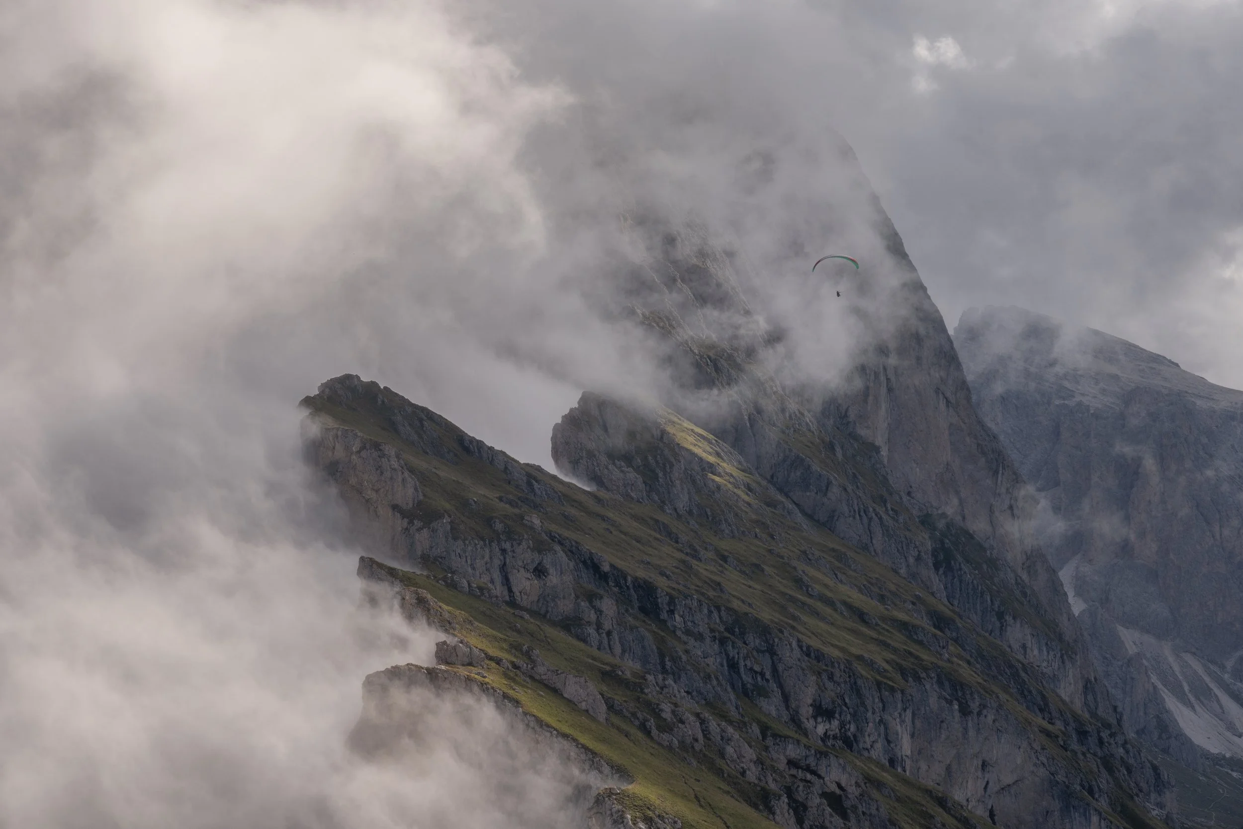 Despite my less-than-perfect vision, something else caught my eye. At first I thought it was a bird, then I realized it was a paraglider flying through the mist like James Bond: