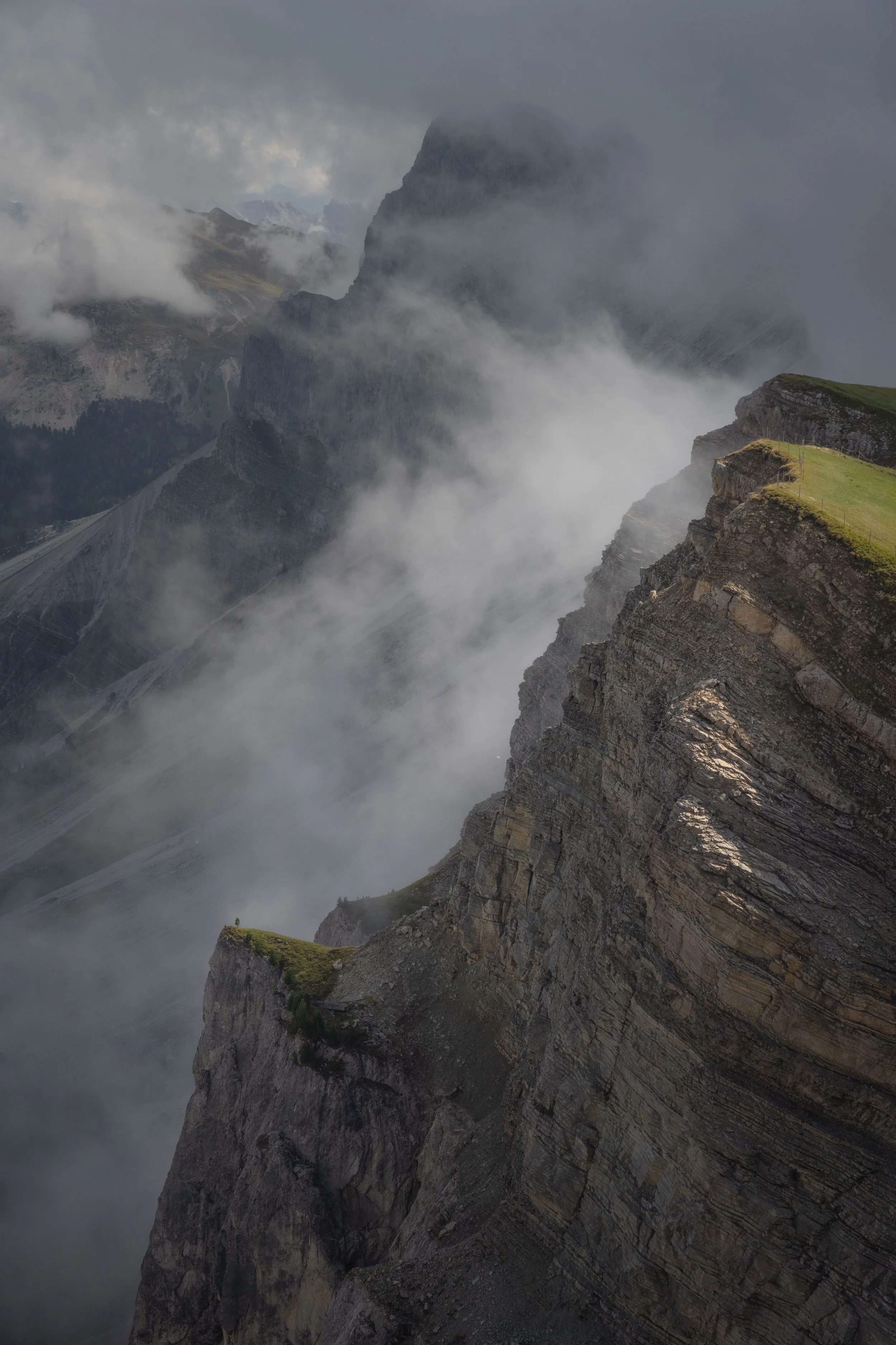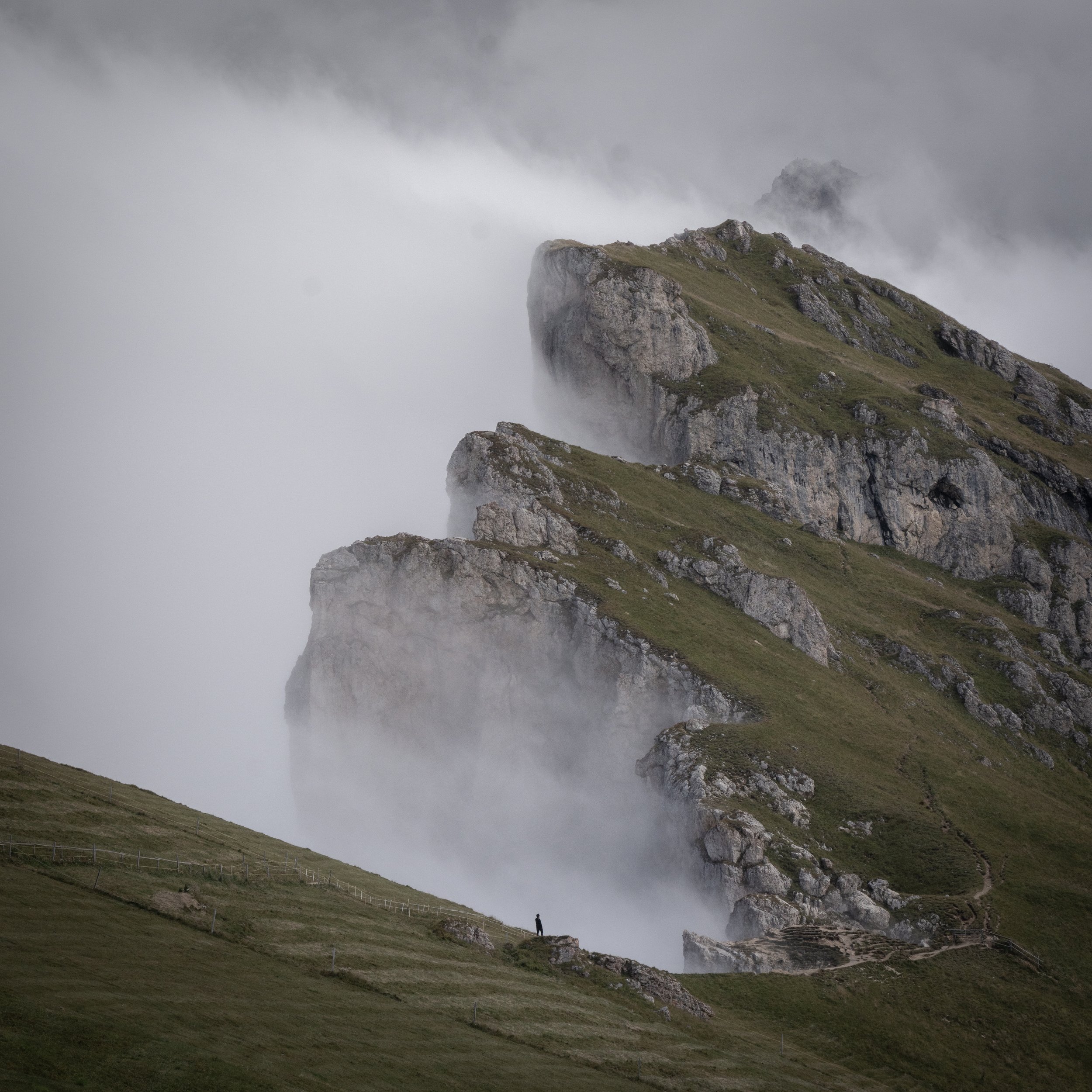 As we got closer to the edge, we began to pick up on the trends of the mist. It’d go in for a couple seconds, then out for a couple seconds as the clouds blew across the mountain. At one point a man emerged from this mist in this magnificent scene: