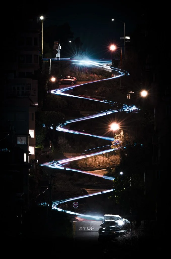 This photo was taken in San Francisco, where I used a two-second timer delay to ensure their was no camera shake caught in the long exposure shot.