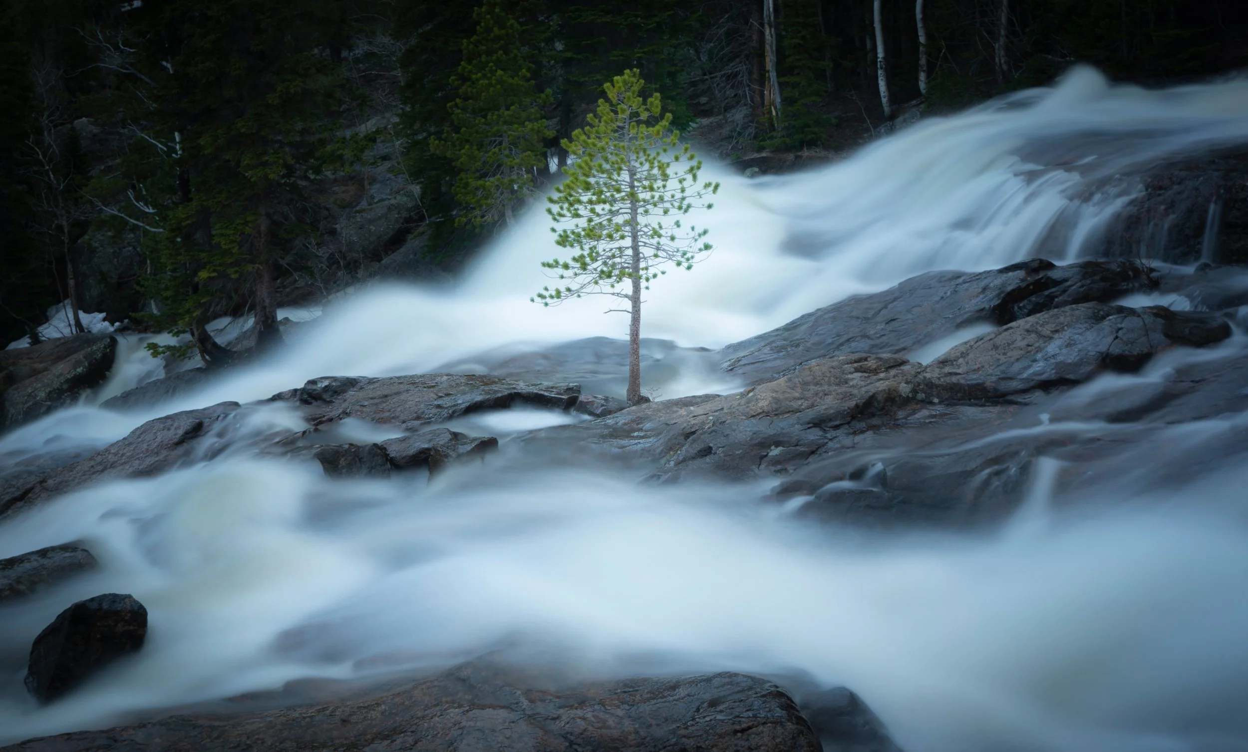 I used a long exposure to make the water look silky and smooth, but in the middle of the frame, there is a sharp, prickly pine tree. The contrast between the smooth water and spiky tree pulls the entire shot together. Not to mention the fact that the tree is essentially silhouetted by the immense flow of water, utilizing contrast of color as well.