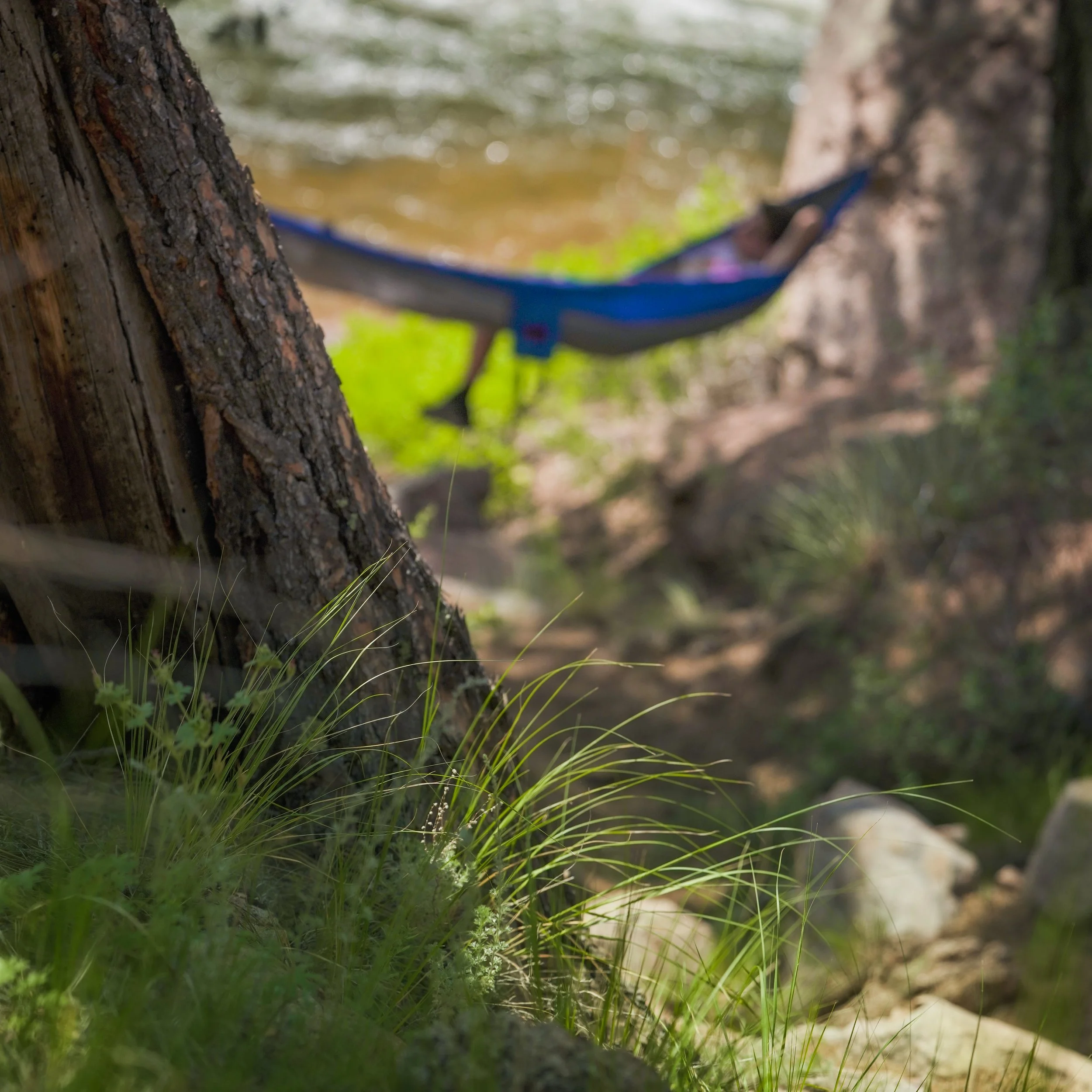 Another way to create contrast in texture is by intentionally putting your subject out of focus, which goes against traditional photography rules. For example, in this shot, I’m lying on a hammock in the background, but the tree and blade of grass in the foreground are sharp and in-focus: