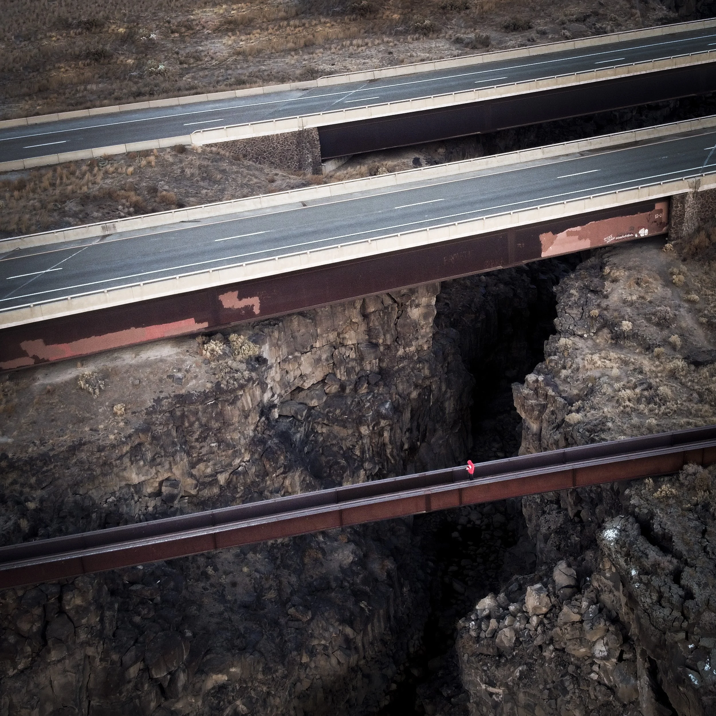 This creates a visual metaphor: nature, represented by the cavern, versus the man-made highway going over the top of it. In this case, man was able to conquer nature and build a solution to get across.