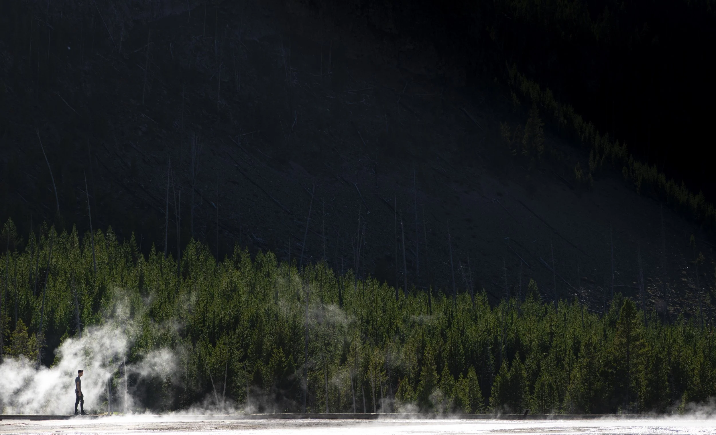 Finally, let’s talk about space. The most obvious type of contrast here is positive versus negative spaces. For example, in this photo taken at a geyser in Yosemite, I am silhouetted against white steam while a dark forest fills the background: